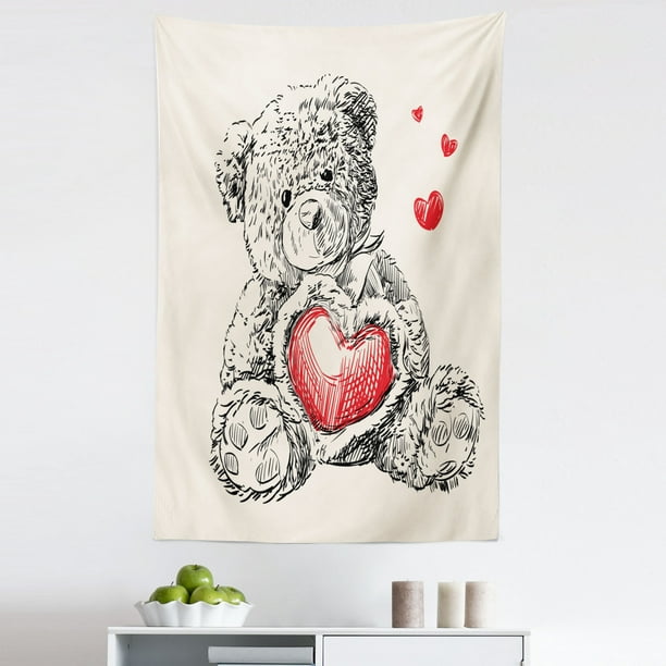 Cartoon Tapestry Detailed Teddy Bear Drawing With Heart Instead Of A Belly Mini Floating Hearts Fabric Wall Hanging Decor For Bedroom Living Room Dorm 5 Sizes Red Black White By Ambesonne